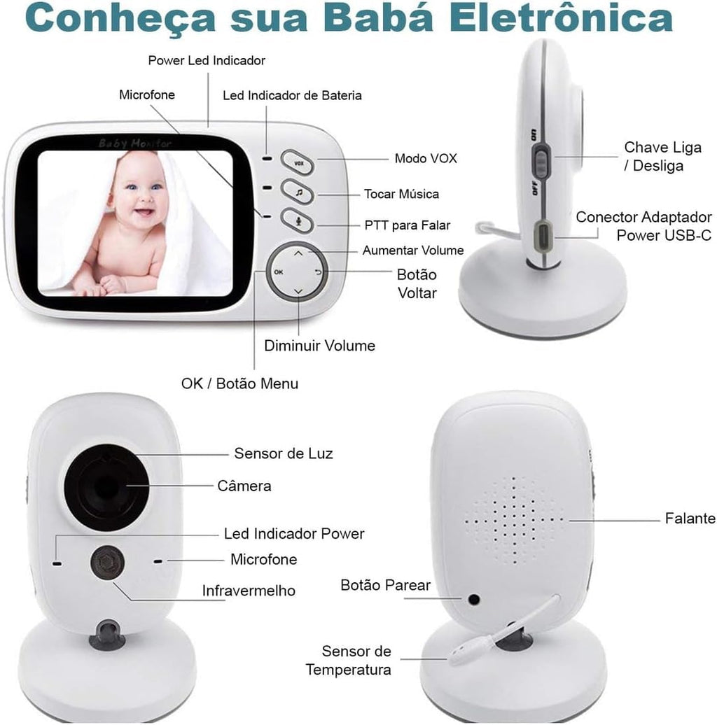 - Áudio bidirecional: sistema de comunicação que permite ouvir e falar com o bebê, incluindo função VOX para detecção de som e canções de ninar