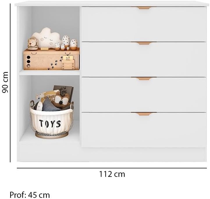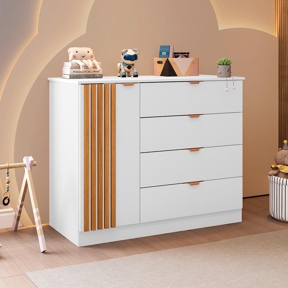Características: Estrutura em MDF Acabamento em Pintura UV 01 Porta de bater com Dobradiças Metálicas 04 Gavetas externas com Corrediças Telescópicas Design em Ripado Puxadores Rosê Gold Prateleiras internas com amplo espaço OBJETOS DECORATIVOS NÃO ACOMPANHAM O PRODUTO. Limpar utilizando apenas pano umedecido com água, nunca utilizar abrasivos ou esponjas de aço. Acompanha manual e todos os acessórios para montagem. Recomendamos que a montagem seja feita por um profissional. Garantia de 03 meses para eventuais defeitos de fabricação. Dimensões: Altura: 90 cm Largura: 112 cm Profundidade: 45 cm Itens Inclusos: 01 Cômoda ATENÇÃO, OBSERVAÇÕES IMPORTANTES. As imagens são meramente ilustrativas, não serão enviados objetos de decoração, eletrônicos e demais itens que não estejam especificados nos itens inclusos. É indispensável que seja feita a conferência do produto no ato da entrega e caso haja alguma divergência, seja feito o contato imediato com a loja e notificação no canhoto. Constatando defeito no ato da entrega o produto não deverá ser montado até tratativa com a loja. Não será efetuada a troca do produto após a montagem ter sido efetuada. A montagem é de total responsabilidade do cliente e defeitos na montagem serão tratadas como assistências. Os processos de pendências serão tratados mediante a fotos para analise e conferência da informação. As cores do produto podem variar de acordo com o seu monitor, a iluminação do ambiente em que você está e até mesmo a sua percepção visual. Não nos responsabilizamos, no ato da entrega, por subir escadas e elevadores. Eventuais despesas são de responsabilidade do cliente. Dúvidas serão tratadas via protocolo.